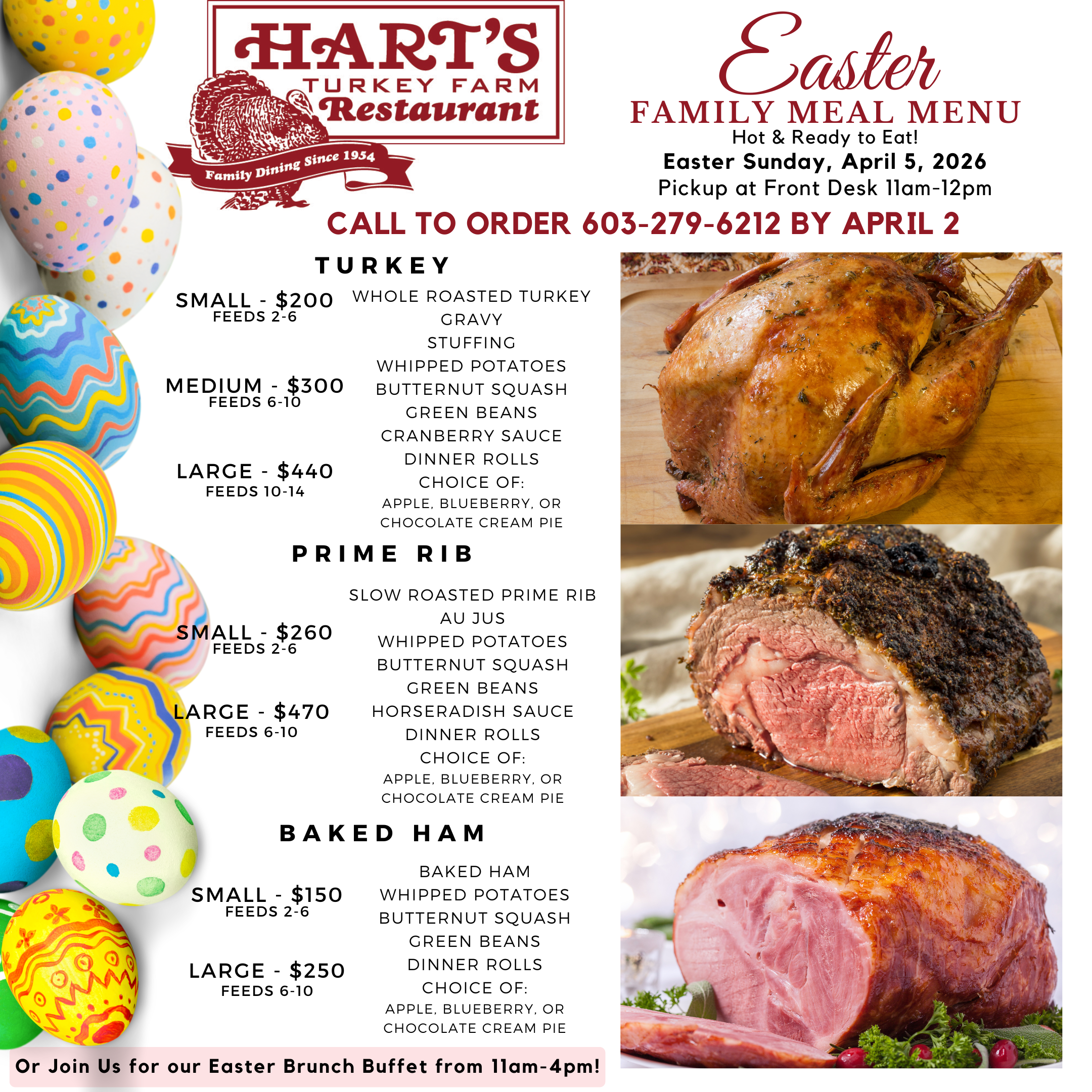 Prefer to celebrate at home? Hart’s will also offer all-inclusive Family Meals for pickup from 11am–12pm. Family meals must be preordered by April 3, and regular takeout will not be available that day. Check out the menu below!