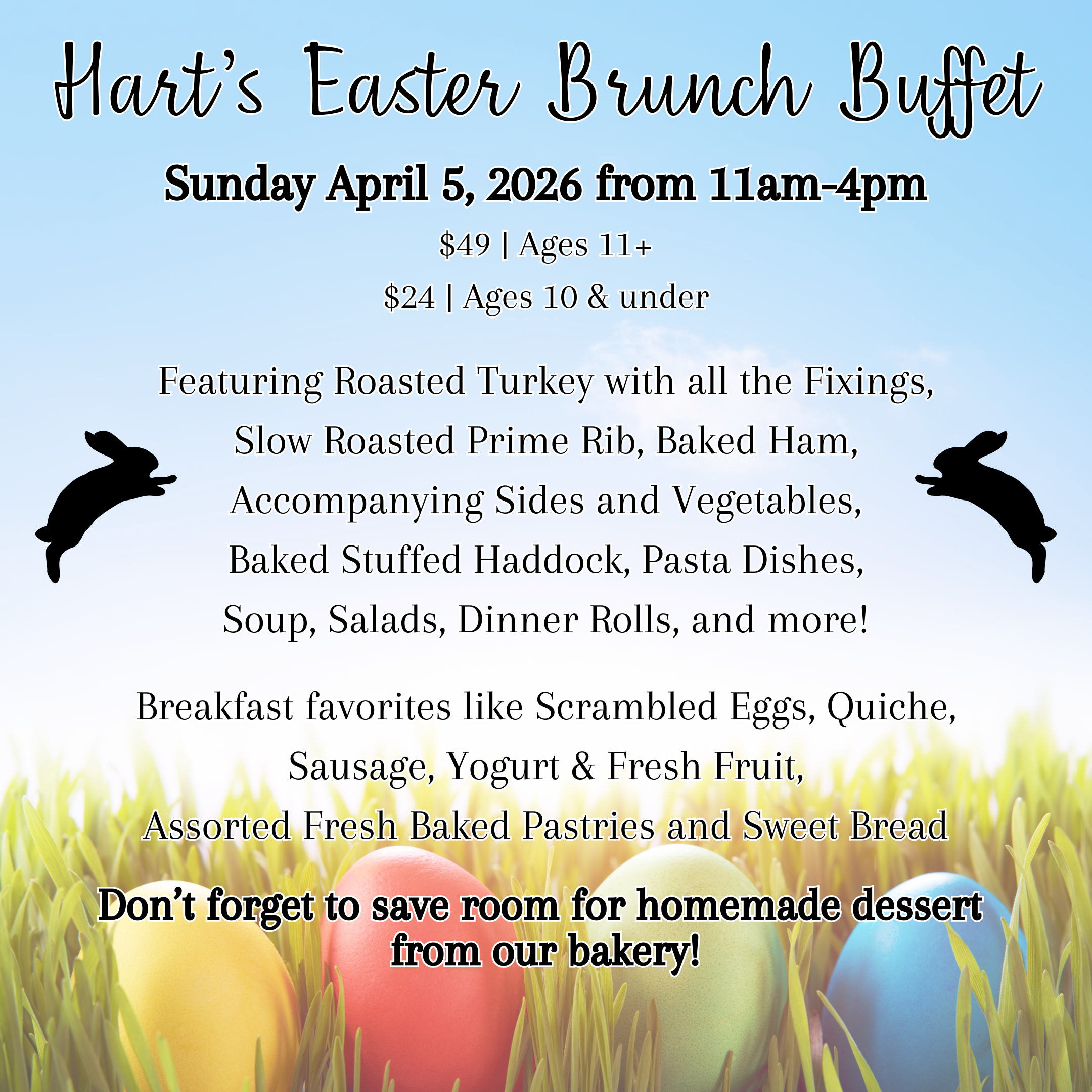Celebrate Easter with family and friends at Hart’s Easter Brunch Buffet on Sunday, April 5 from 11am–4pm. Enjoy a festive spread of brunch favorites and seasonal dishes in a warm, welcoming setting.